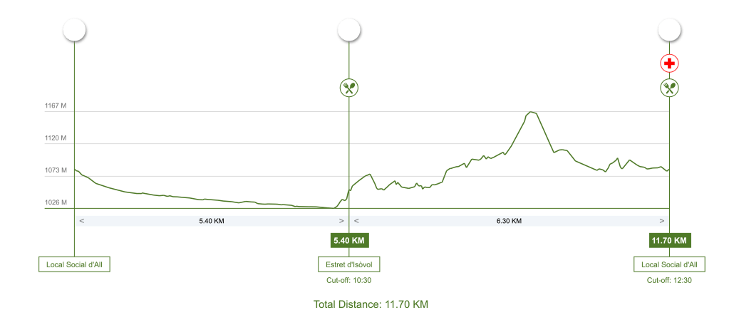 Sortida ràpida fins a Olopte, des d’allà, pujada per la via ràpida al Tossal d’Isòvol. Després, baixada fins al riu Duran i pujada llarga fins al Salt de Comaní on cal arribar amb forces per no quedar abatut, per acabar baixada ràpida fins a meta.